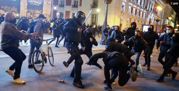 И снова привет, двойные стандарты. Сейчас испанцы спрашивают накаченных силовиков, когда выйдет погулять их любимый репер Пабло, который, кстати, критиковал монарха и полицию, а потом призывал к террору. Напомню, музыканта приговорили к 10 месяцам колонии. Добровольно сдаться он не пожелал и забаррикодировался со своими сторонниками в университете. После штурма его все-таки удалось затолкать в «бобик».