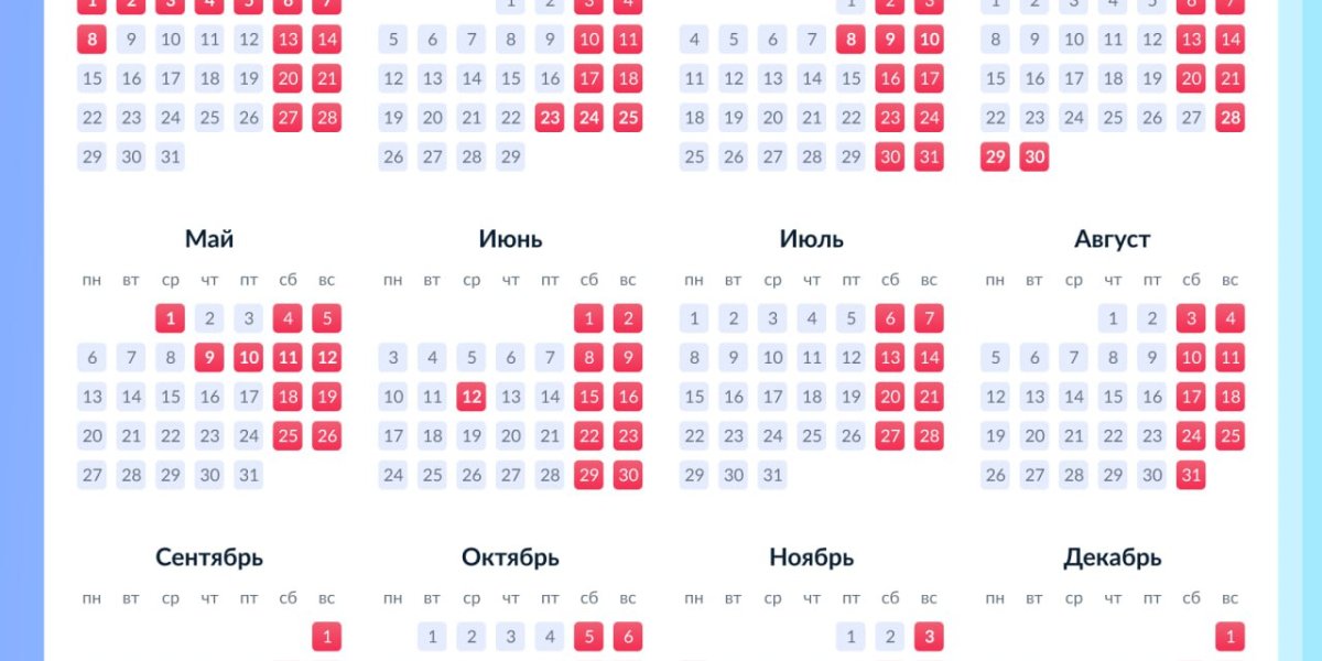 В 2024 году будет несколько периодов длинных выходных: